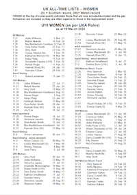 ![]() All-Time UK Women's Lists: Senior, U23, U20, U17, U15, U13 Standard and Short Track All events including road races, walks, relays, combined events |