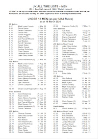 ![]() All-Time UK Men's Lists: Senior, U23, U20, U17, U15, U13 Standard and Short Track All events including road races, walks, relays, combined events |